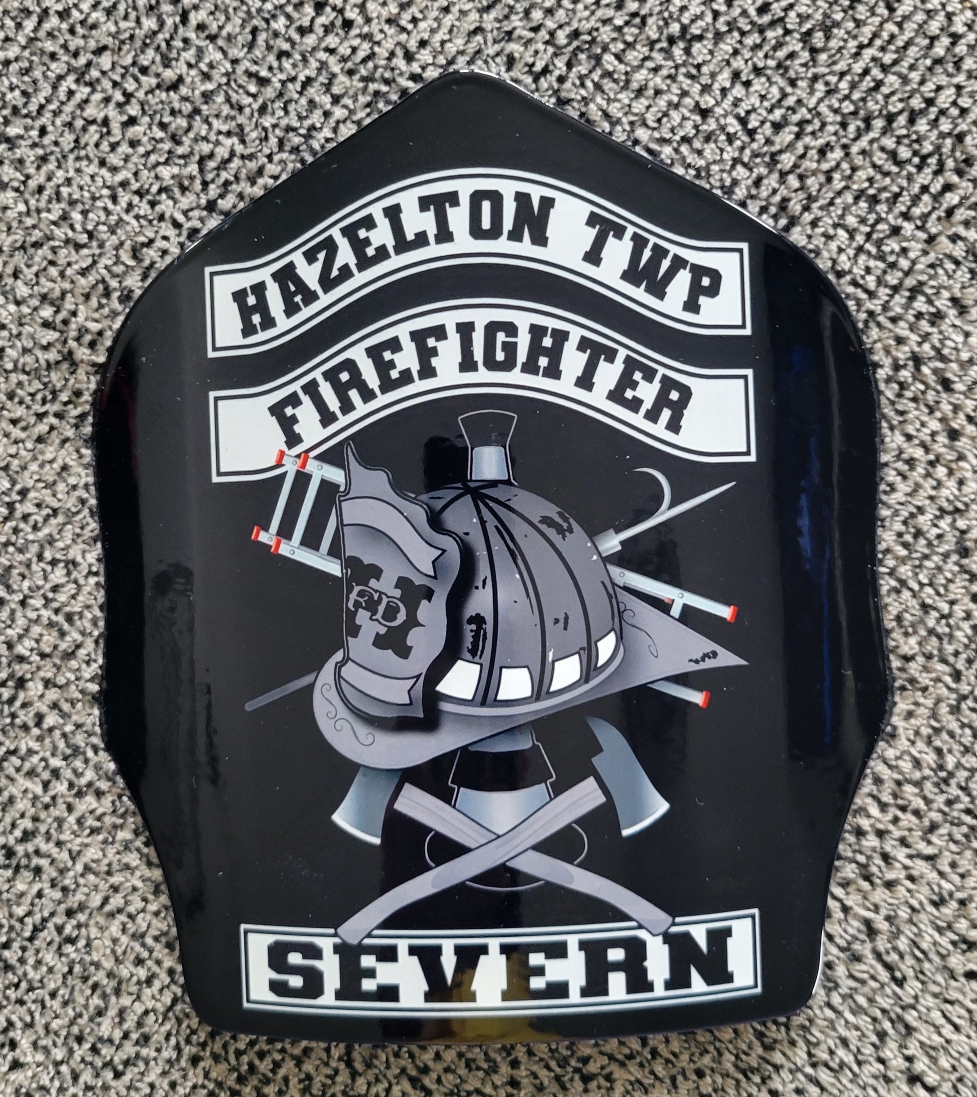 Shields can be curved for a helmet or flat to hang in the station, office, or home.