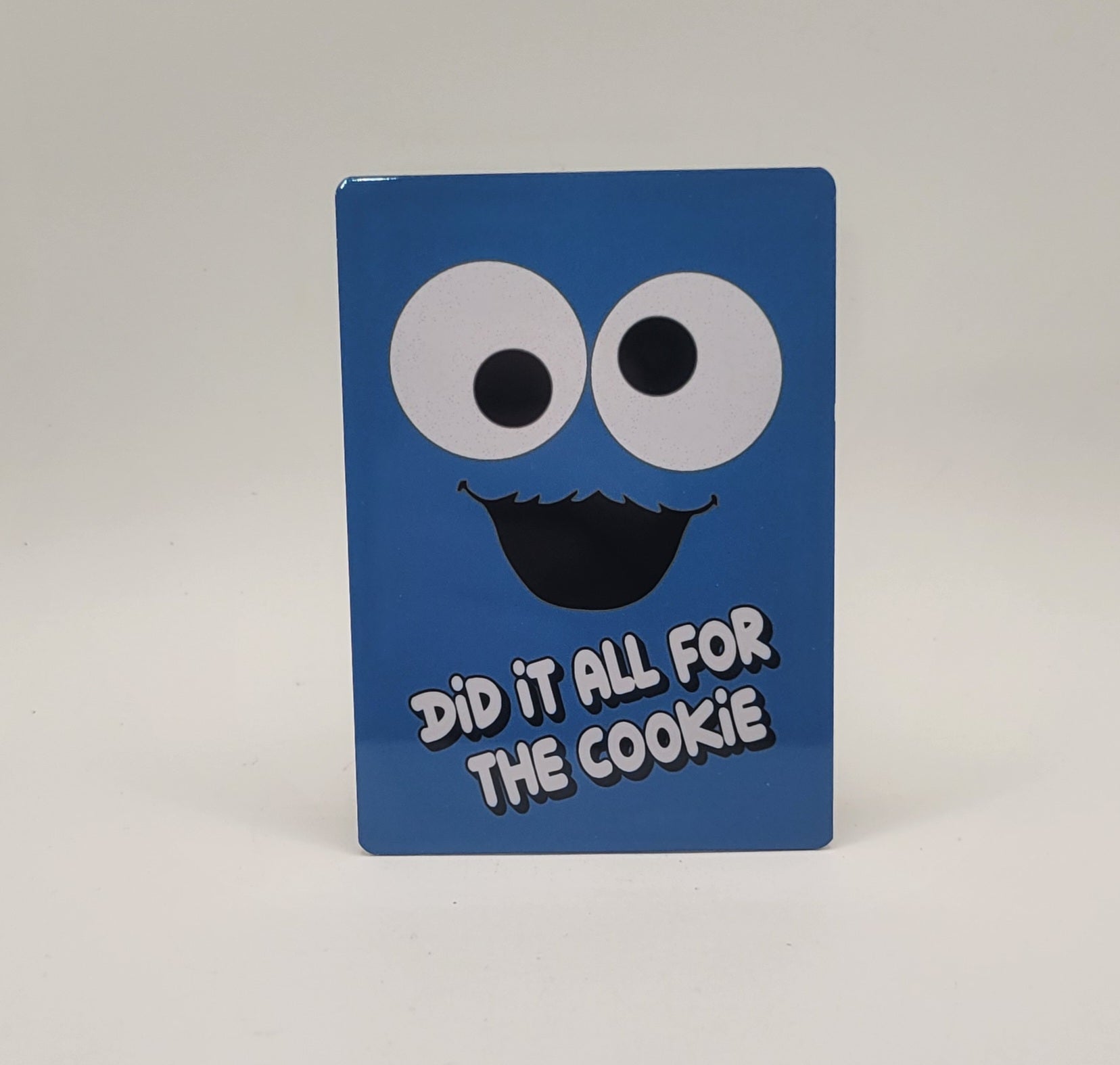 Give your helmet some character with a Did It All For The Cookies, parody helmet card.