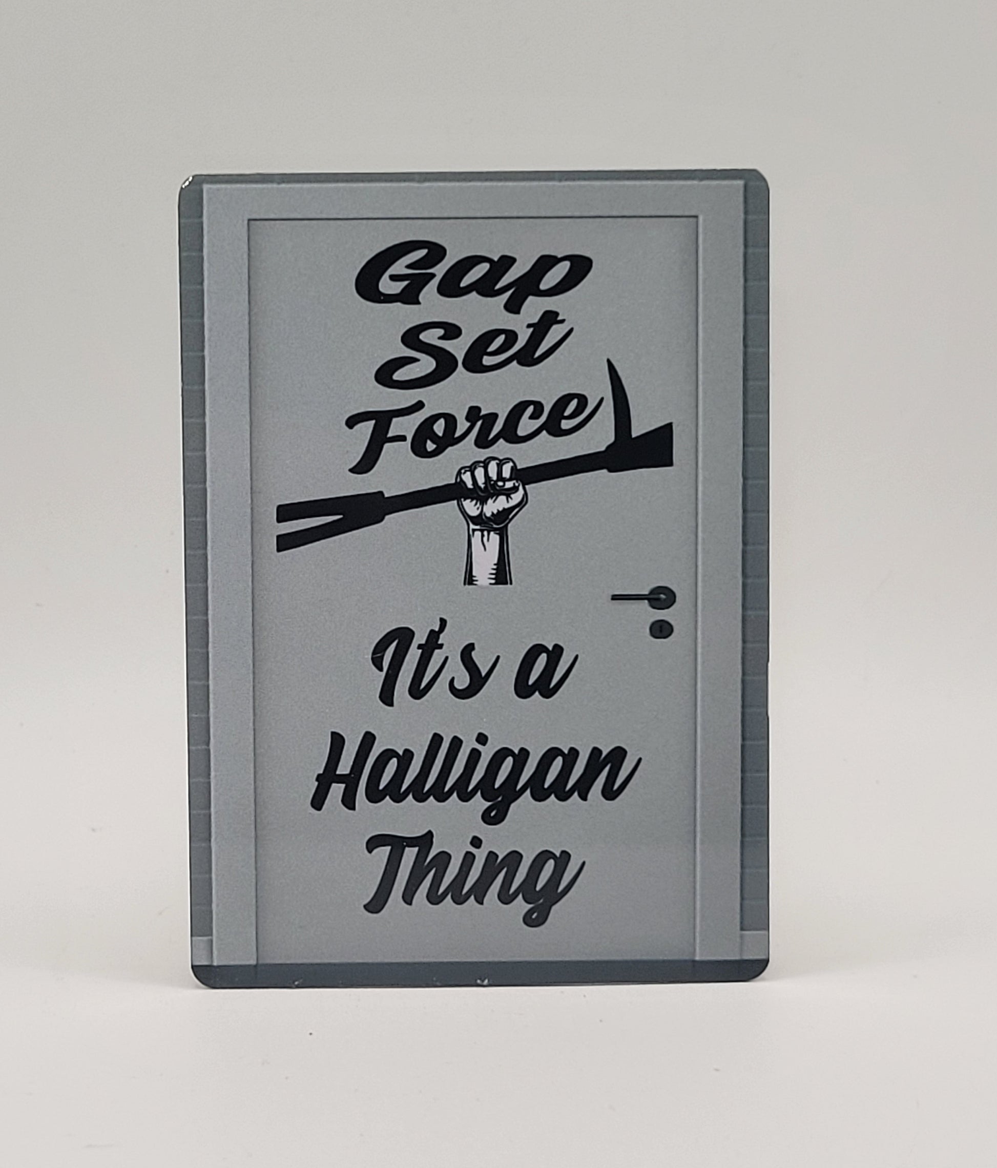 Give your helmet some character with a Gap, Set, Force, IT's a Halligan Thing , parody helmet card.