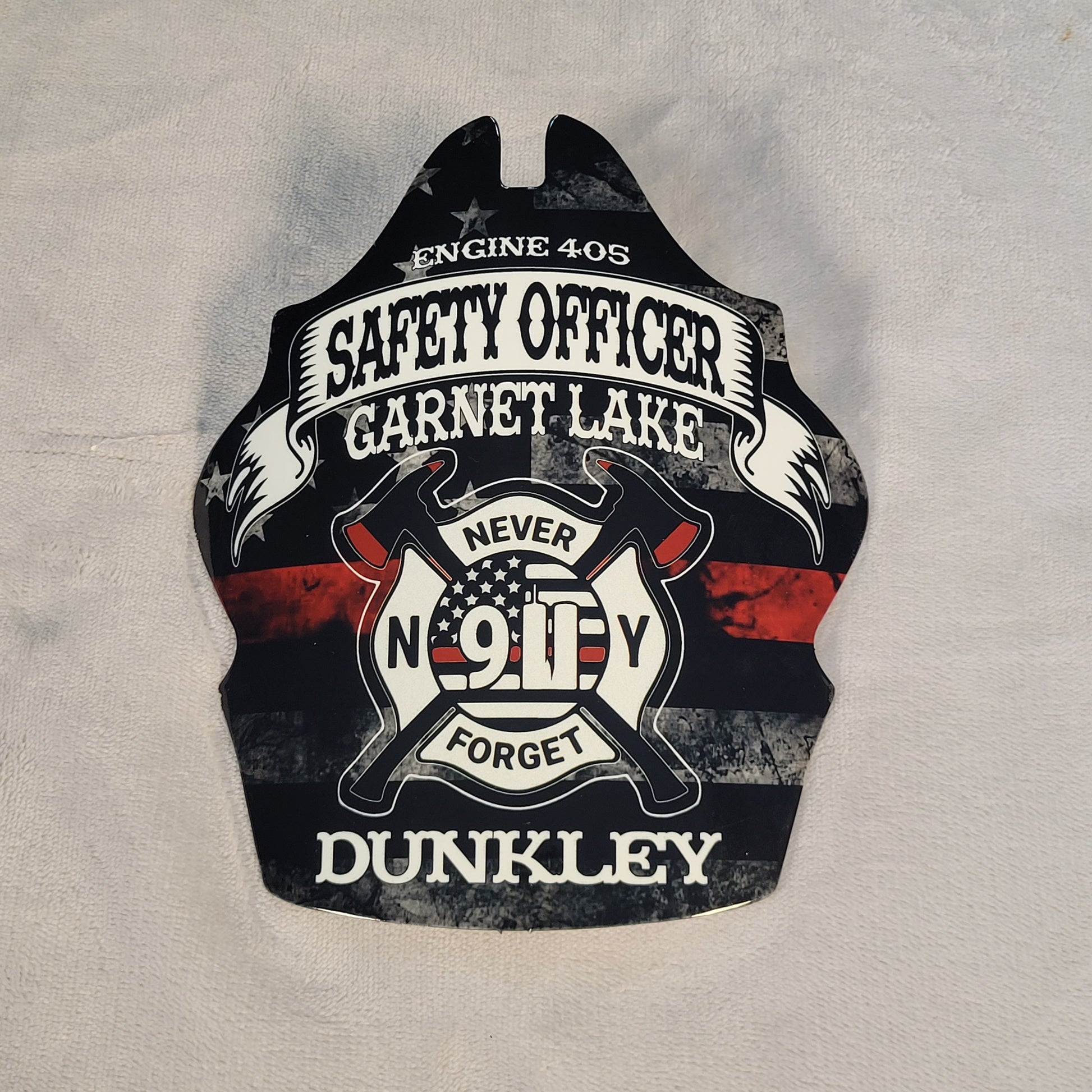 This shield has classic thin red line background with fancy single ribbon. Classic fire department logo can be altered. This shield was the base to other great designs.