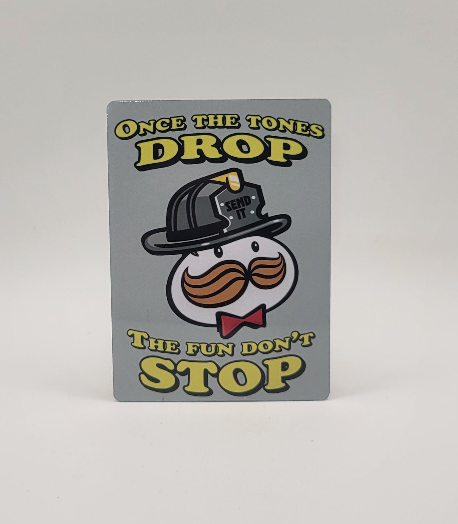 Give your helmet some character with a Once the Tones DROP, The Fun Don't STOP parody helmet card.