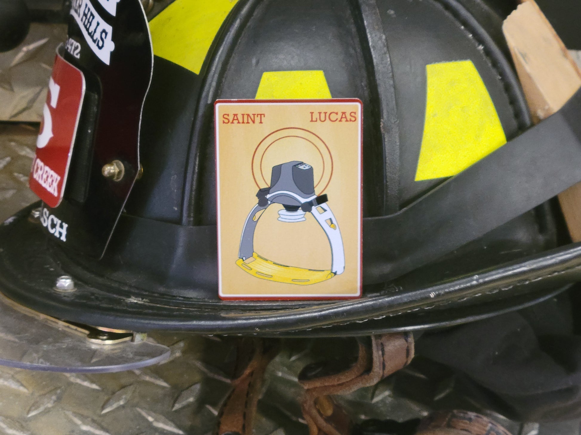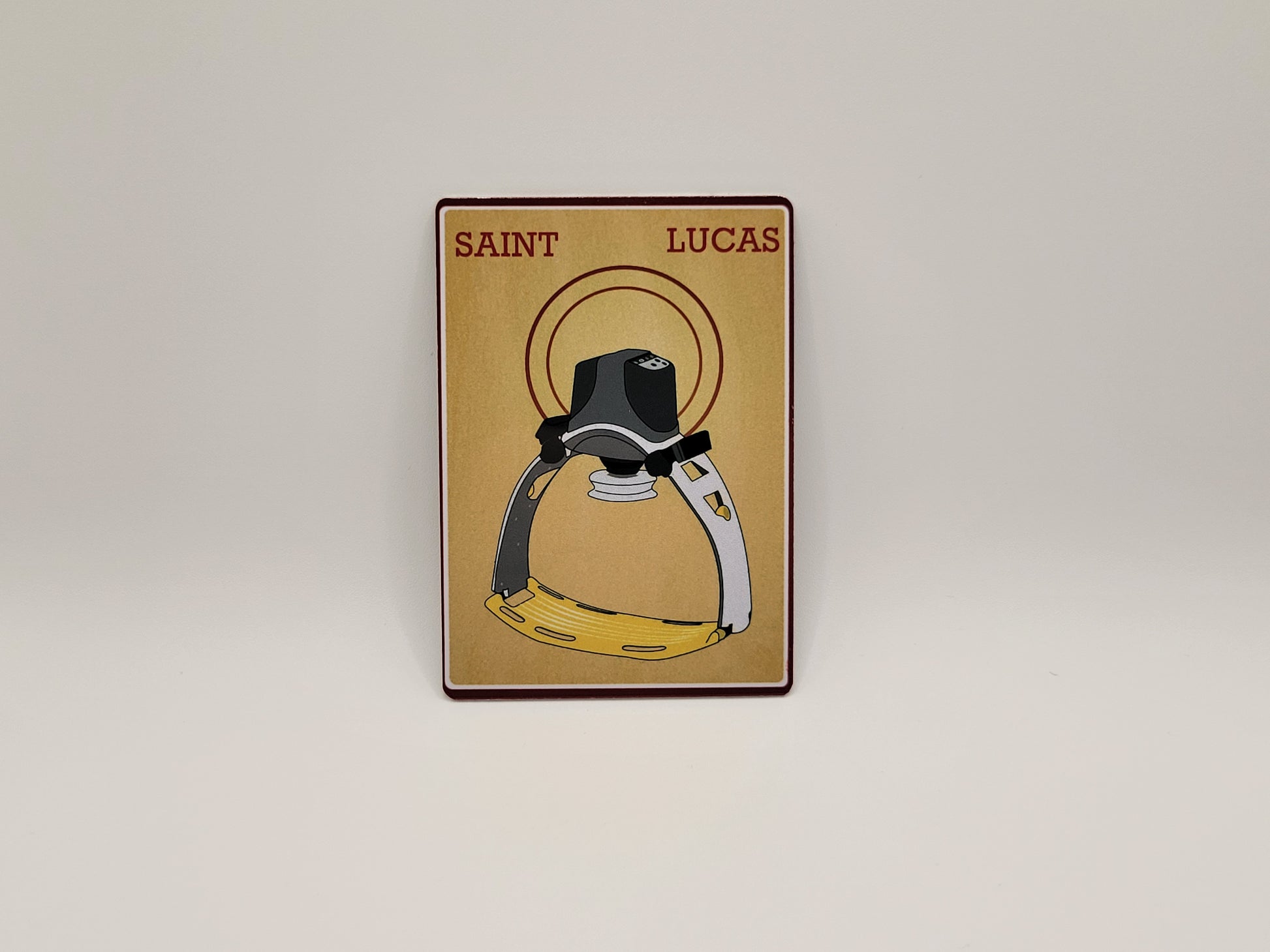 Give your helmet some character with a Saint Lucas Metal Playing Card!